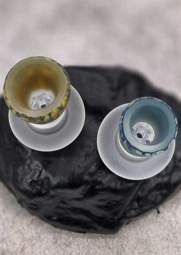 Available and in stock in 14mm ONLY. All are martini style Slides with Blazin Blue Glass multi hole screens